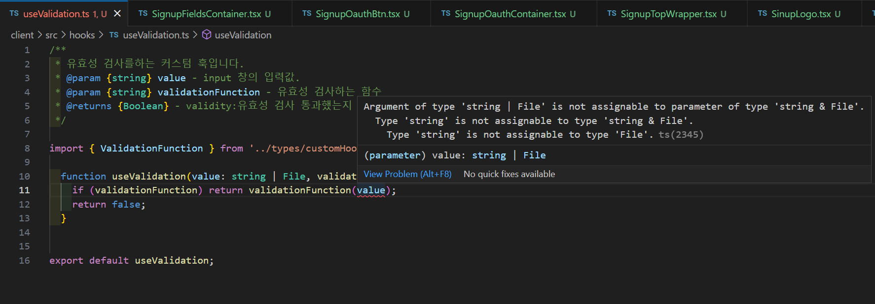 여기만 보면 validation 관련해서는 티가 안나는데 그 부분은 useValidation에서 설명하도록 하겠다. useValidation이 지금 코드상태에서 필요한 커스텀 훅인지는 아직 의문이 남아있기는하다.