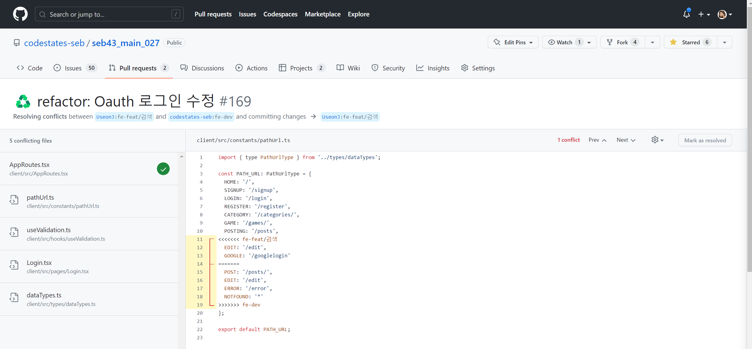 그리고나서 현재 작업한 부분 중에 Oauth 작동되는지 확인하고 싶다고해서 그 부분만 풀리퀘를 날려준다..