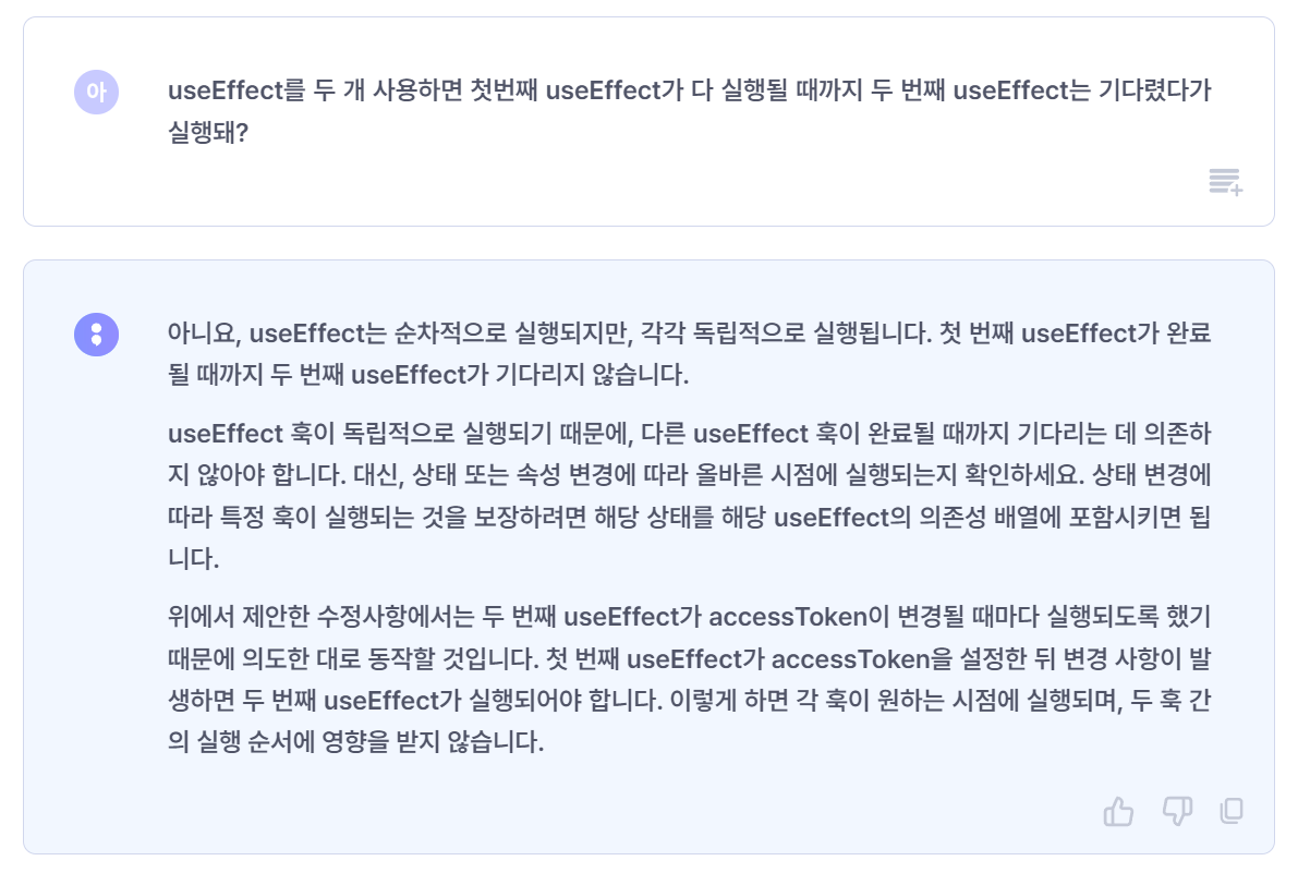뤼튼은 useEffect를 두 개 사용해서 첫 번째 useEffect는 렌더링되자마자 작동하도록 만들고, 두 번째 useEffect는 첫 번째 useEffect에서 accessToken이라는 상태가 변할 경우에 그것을 감지하여 작동되도록 만들라고 하였다. 그래서, 순서대로 작동하는 것인가라는 어리석은 질문에 의존성 배열을 잘 설정해서 동시에 실행될 수도 있는 코드들을 논리구조로 동기적으로 작동하도록 만들라는 의도였음을 파악했다.