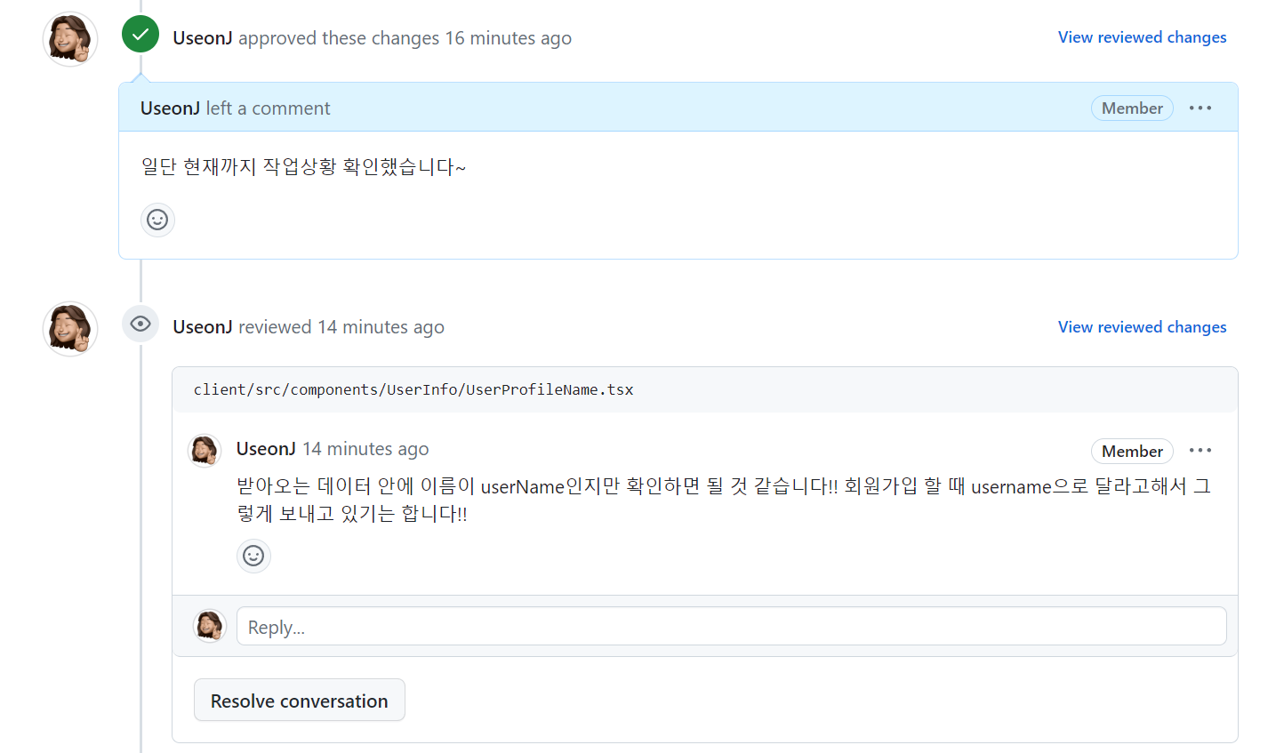 풀리퀘에 적어준 내용을 잘 읽은 뒤 리뷰로 의견공유도 해준다.