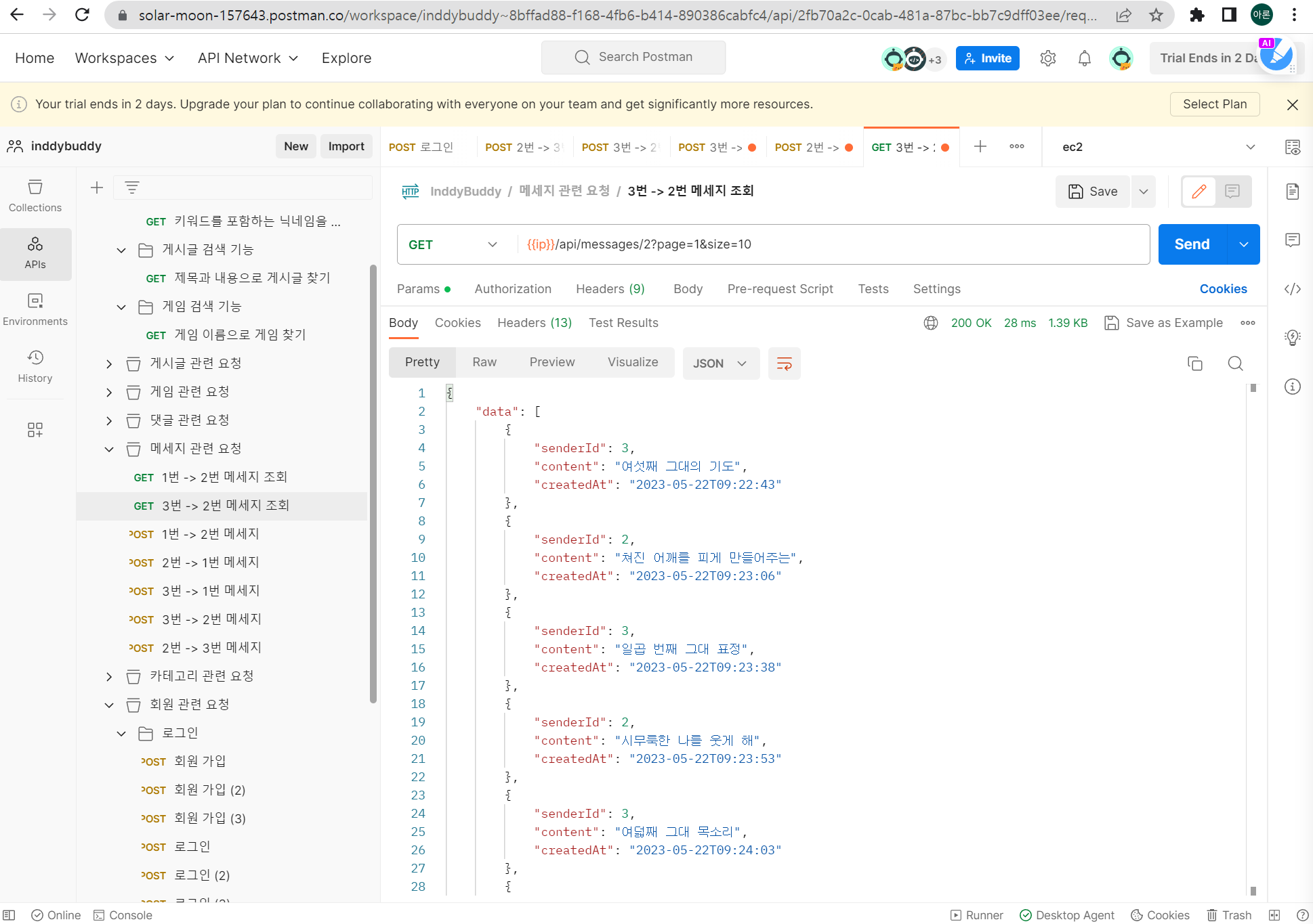 근데 현재 팔로워가 없다고 자꾸 나오므로 Postman으로 팔로워를 만든 다음에 메세지를 주고받아보겠다.