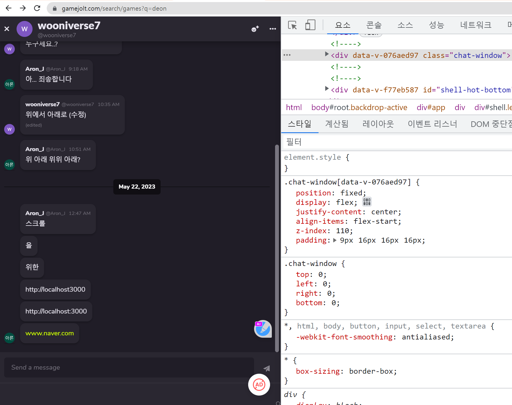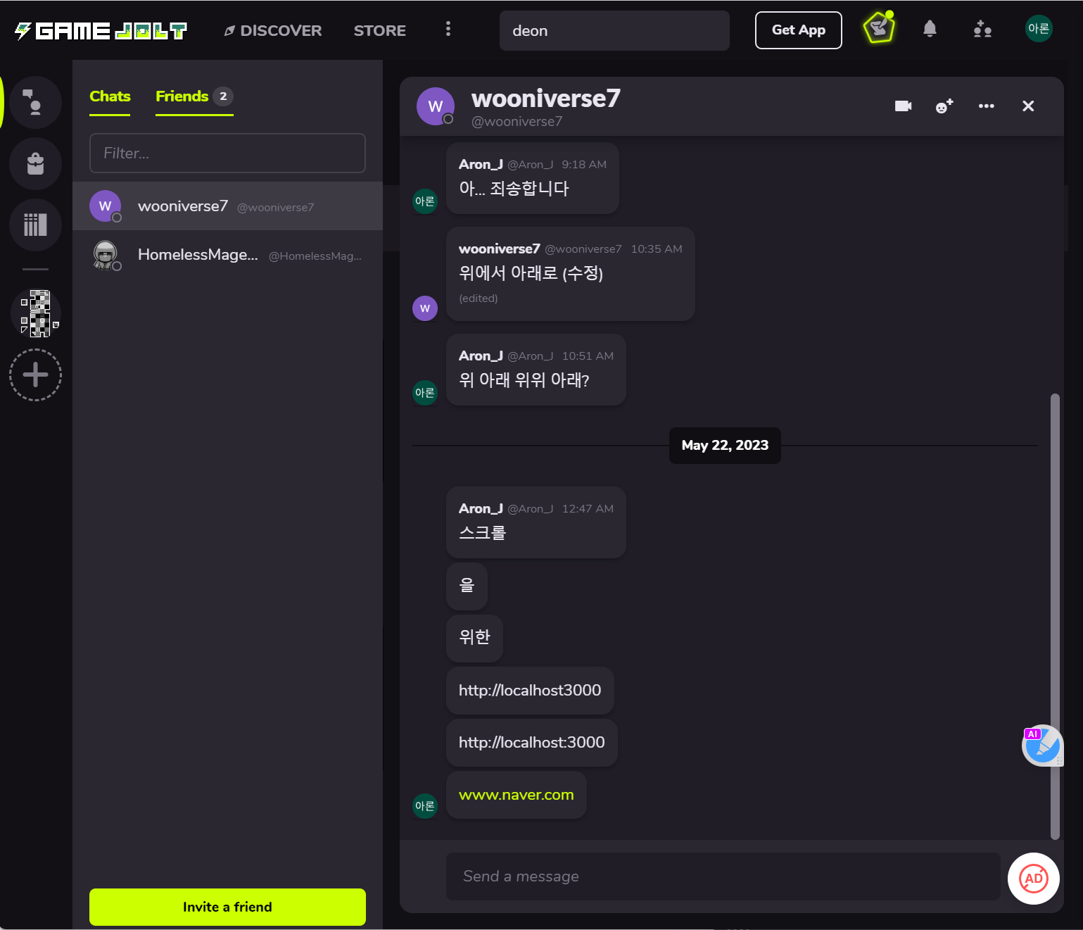 링크를 보냈을 때, 클릭 시 경고메세지를 띄우는 기능도 넣고 싶어서 혹시 gamezolt에도 적용되었나 싶었는데 여기는 아직 그 부분에 대해서는 신경을 쓰지 않고있다. 그리고 로컬호스트 주소는 활성이 되지않고 www.naver.com 과 같은 주소에는 프리플라이트 같은 것으로 접속가능한 주소인지 확인하는건지(이건 브라우저 내장된 기능이 아닌가 싶다) 활성화된 색으로 표시된다. 아마 html 링크 색상 바꾸는 css를 적용하면 나도 바꿀 수 있지 않을까 생각한다.