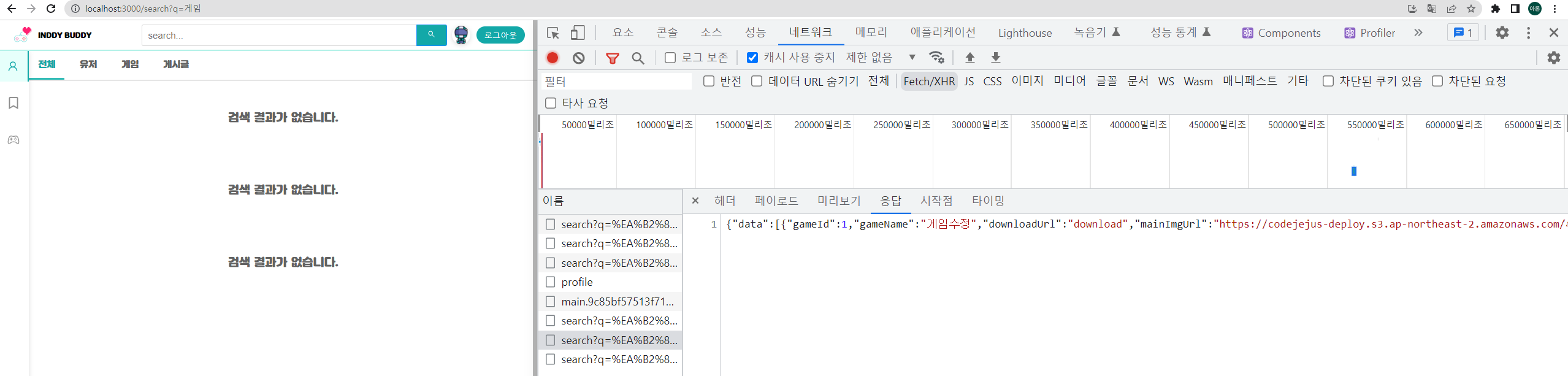 어제 자꾸 막힌 부분이었는데, get요청을 잘못보내는지 정보가 제대로 도착하지 않는다. Promise.All코드를 킵해놓고 게임 검색에 대한 정보부터 받아와서 해보았다.