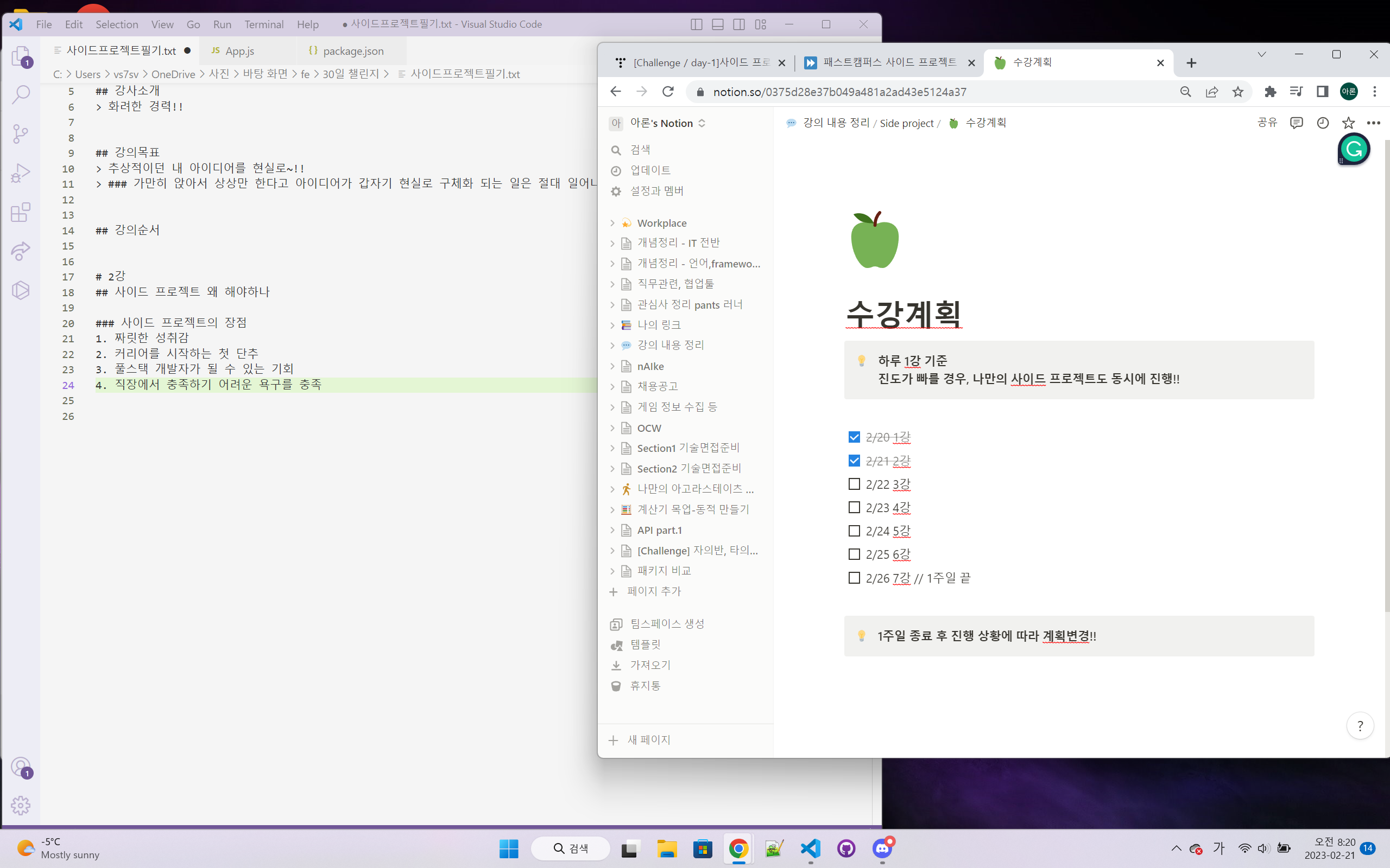 vscode에도 새 내용을 추가하고 수강계획에 체크까지 오늘공부 끝!!