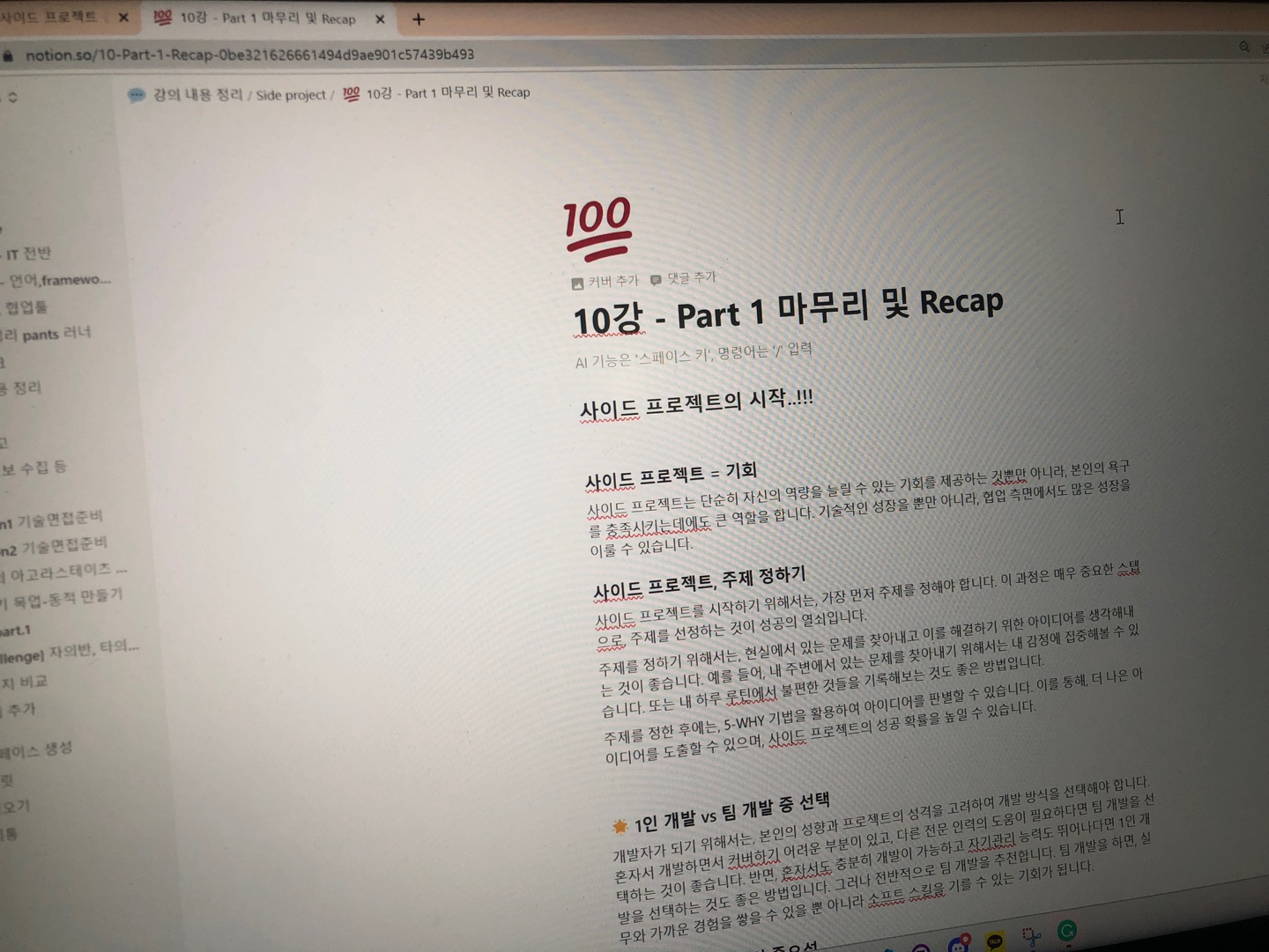 개발자가 되기 위해서는, 본인의 성향과 프로젝트의 성격을 고려하여 개발 방식을 선택해야 합니다. 혼자서 개발하면서 커버하기 어려운 부분이 있고, 다른 전문 인력의 도움이 필요하다면 팀 개발을 선택하는 것이 좋습니다. 반면, 혼자서도 충분히 개발이 가능하고 자기관리 능력도 뛰어나다면 1인 개발을 선택하는 것도 좋은 방법입니다. 그러나 전반적으로 팀 개발을 추천합니다. 팀 개발을 하면, 실무와 가까운 경험을 쌓을 수 있을 뿐 아니라 소프트 스킬을 기를 수 있는 기회가 됩니다.