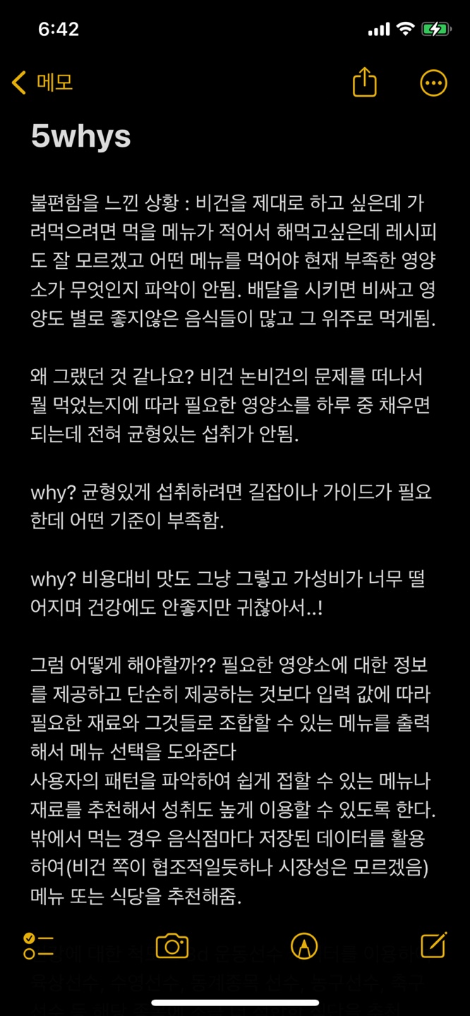 5whys기법은 내가 이 서비스를 무엇을 위해 하려고하는지 근간부터 흔들어놓아서 아이디어 자체에 대해 깊이 생각해보아야겠다고 느끼게 만들었다. 그런 점에서 매우 도움이 되었고... 지금 이 글을 작성하는 중에도 내 아이디어는 발전 또는 폐기예정인 아이디어로 되어가고 있다...ㅋㅋㅋ 😂😂😂😂😂