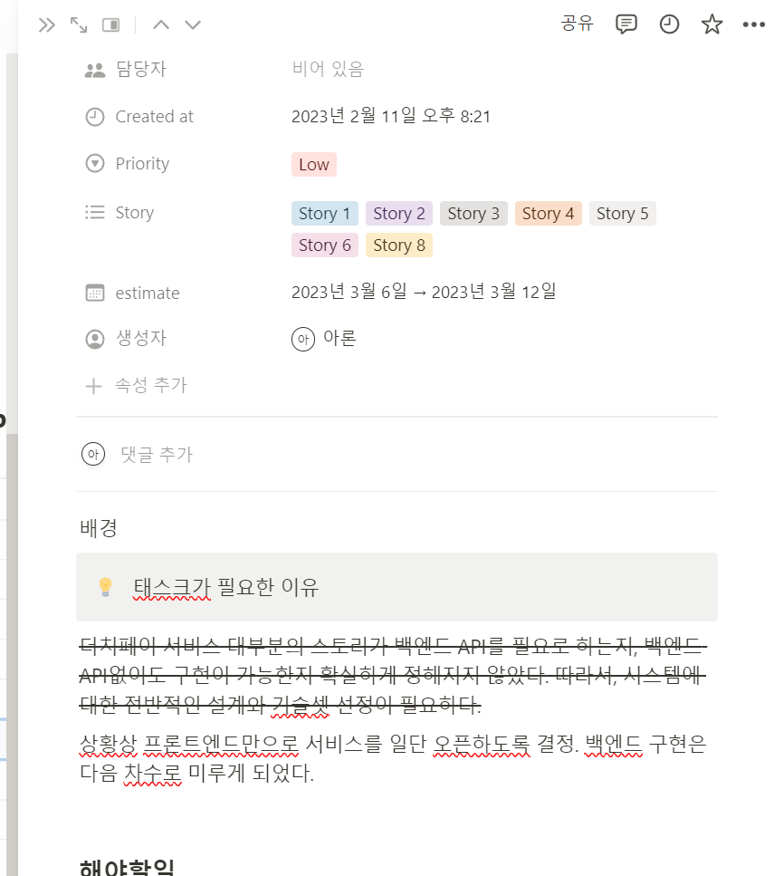 priority도 low로 바꿔서 나중에 진행할 일로 만들어서 프론트엔드 작업을 수월하게 진행할 수 있도록 하였다. 다음시간에는 이번 파트 복습 및 예습할 내용에 대한 과제가 있을 예정이다.