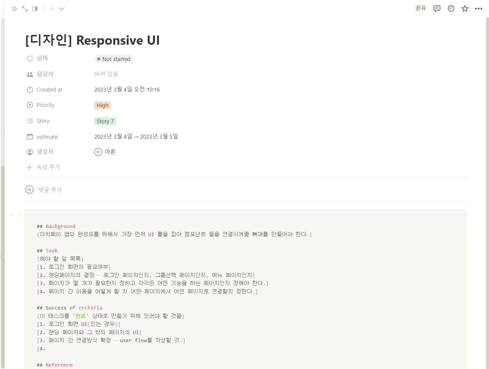 - 담당자: 태스크를 담당하는 팀원의 이름 또는 이메일