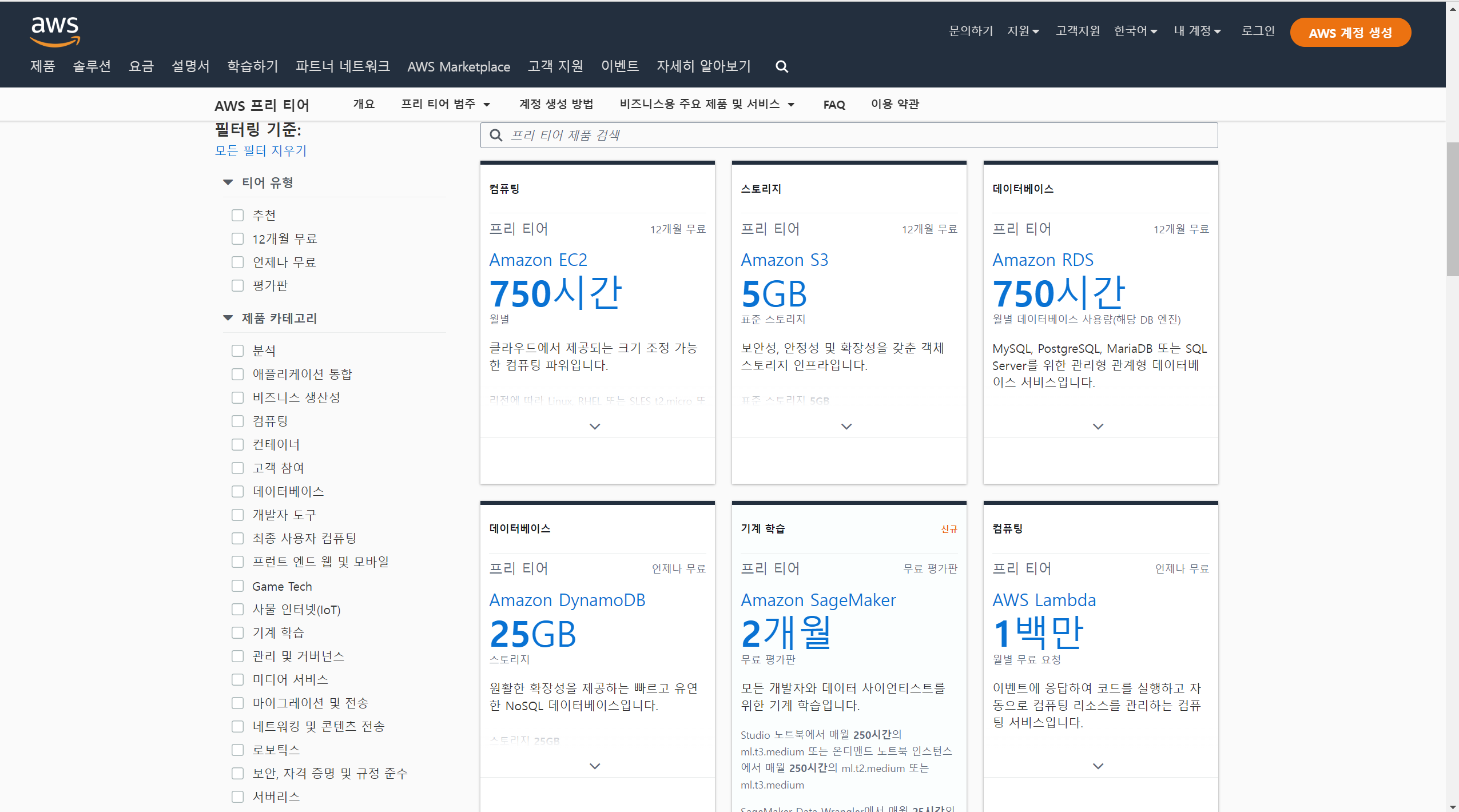 먼저 Free tier 혜택이 무엇인지 살펴보았는데, 사실 이미 2개월 정도인가 전에 aws를 쓸 것 같아서 미리 가입했었는데... 괜히 가입했다. 무료 기능을 초과하는 트래픽이 있는 앱을 1년 안에 만들겠지라는 포부로 일찍 만들었는데 생각보다 속도가 더뎌서 걱정이다. 그렇지만, 돈을 내고도 쓸만큼 충분히 좋은 것 같다.(아직 제대로 쓰지 않은 입장에서 할 말은 아니긴 하다..!!)
