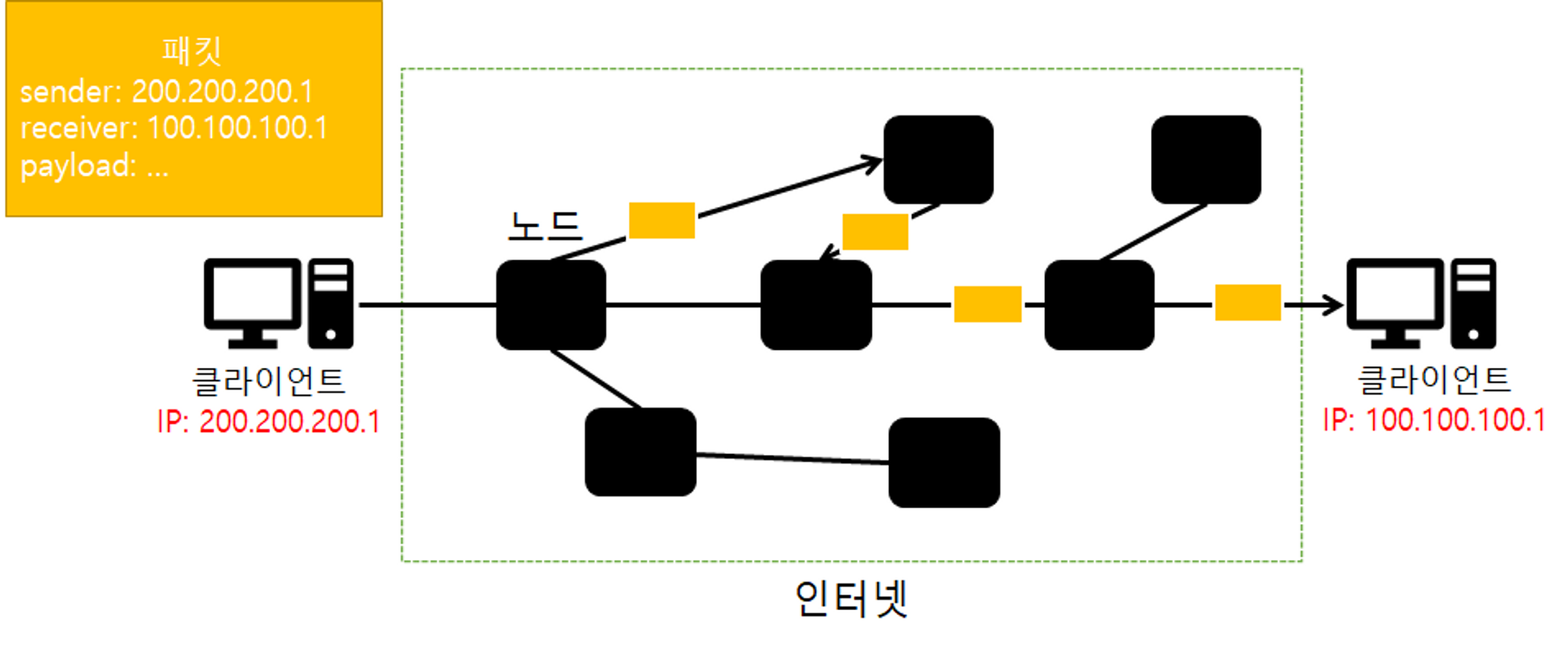 IP란 Internet Protocol의 줄임말로 인터넷을 통해 Source Device에서 Destination Device로 데이터 패킷을 전달하는 역할을 하는 통신 프로토콜이다. 네트워크 계층 프로토콜이며 OSI 7 계층 구조에서는 3번째 계층에 해당된다. IP로 통신이 이루어질 때 지정한 주소에 패킷이라는 통신 단위로 데이터를 전달한다. 패킷이라는 통신단위는 안전한 전송을 위하여 데이터 페이로드(payload)뿐만 아니라 출발지와 목적지의 IP 주소를 가지고 있다. 이렇게 목적지가 저장되어 있으면 연결된 노드 사이에서 목적지를 향해 전달하게 된다. 목적지에서 무사히 데이터를 전송받게 되면 역시 IP Packet의 형태로 응답을 클라이언트에 다시 전송해준다.