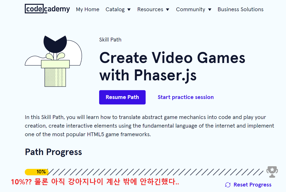 ES6를 중심으로 한 챕터를 더 배우고 바로 간략한 게임만들기가 있을 것 같다. 너무 기대된다. 얼른 다음 챕터를 끝내고 다음 과정으로 가고싶다.. 근데 이제 8% 했다니,,, 이 과정 꽤 길잖아..? 게임만들기는 역시 쉬운 일이 아니다.
