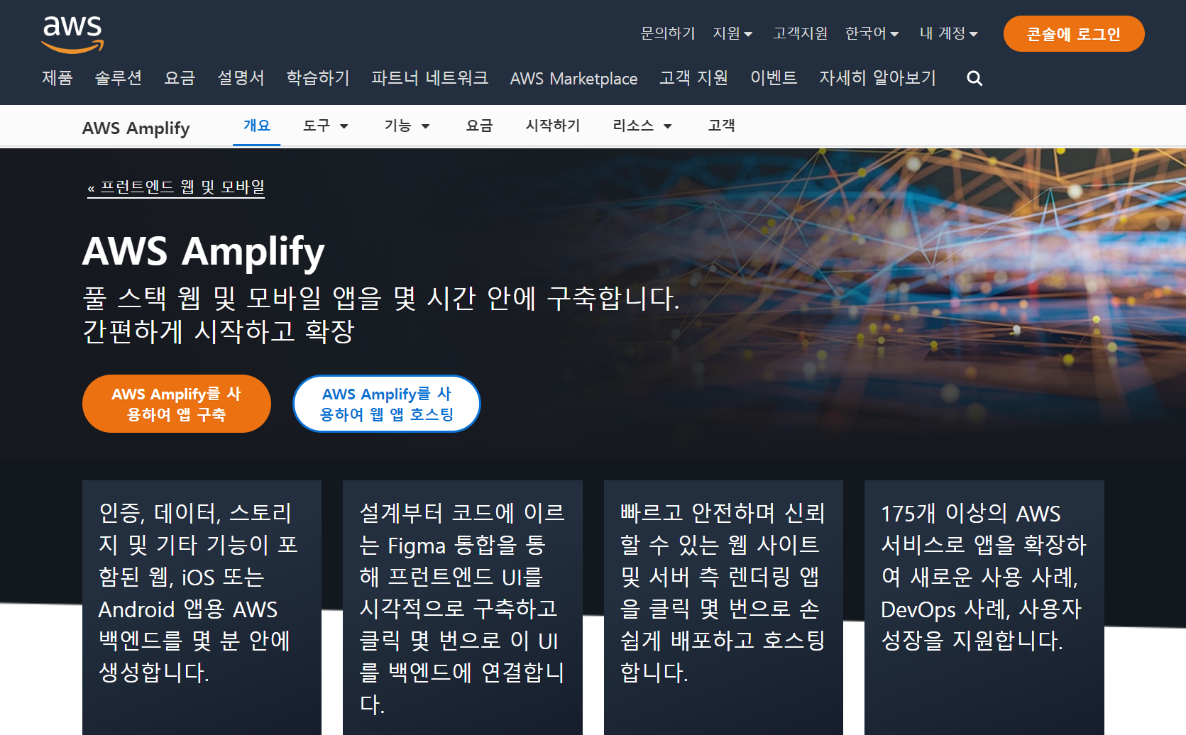 AWS는 클라우드 컴퓨팅 서비스를 제공하며, 다양한 서비스와의 연동이 간편하다는 점이 특징이다. 인증, 서비스 모니터링, 데이터베이스, 앱 푸시 알림 등 다양한 서비스가 제공되며, CLI(Command Line Interface)을 통해 프론트엔드 초기 프로젝트 셋업, 백엔드 프로젝트 셋업, 배포, 웹 호스팅 추가 등 많은 기능을 수행할 수 있다. 또한 AWS는 커맨드 하나면 배포를 끝낼 수 있으며, 별도로 웹 서버 셋팅을 요구하지 않는다는 점에서 매우 편리하다.