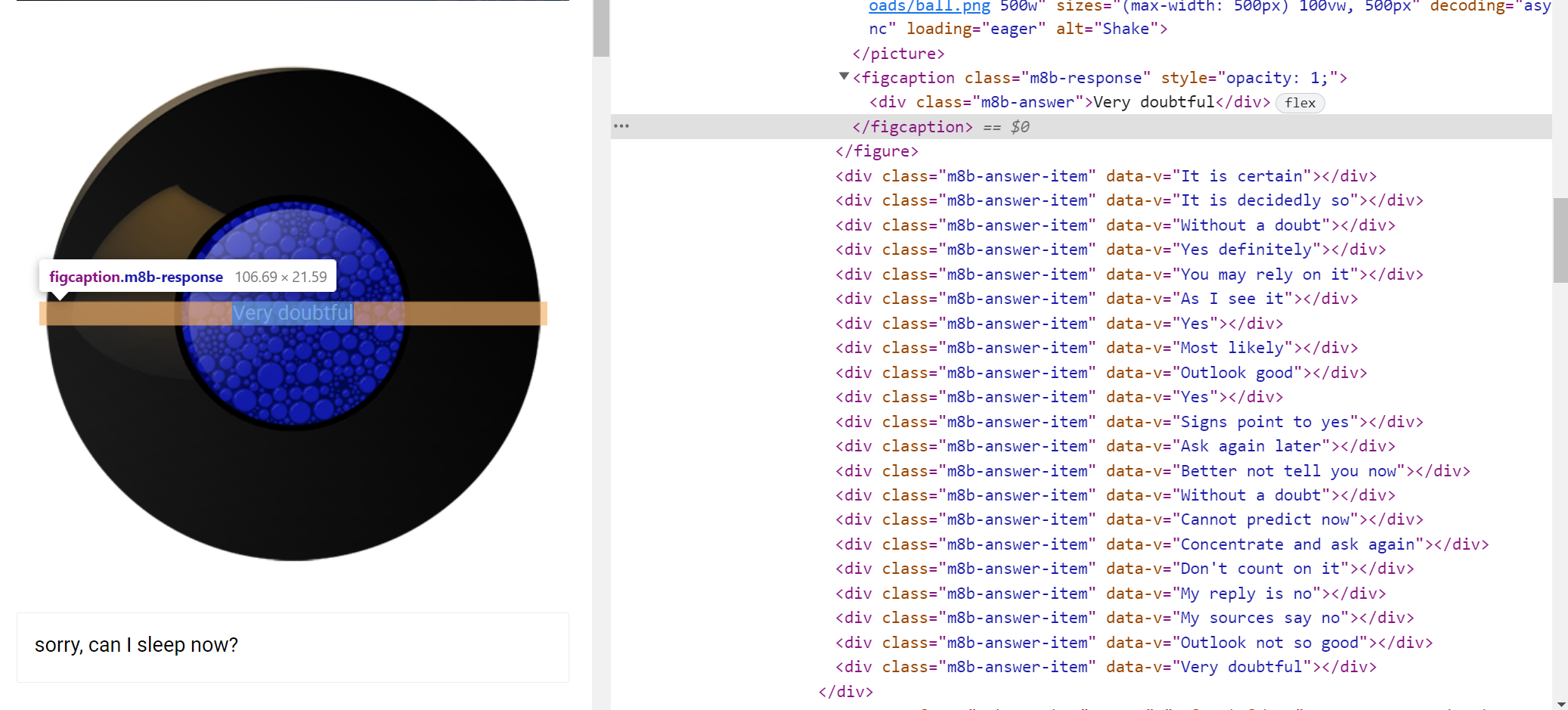figcaption으로 사진의 설명을 보여주는데 사진 가운데다가 위치시켜서 보여준다. 흐음... 밑에 있는 div들이 선택지이고 이것들 중에 data-v속성 값을 랜덤으로 가져오도록 로직을 설계한 것 같다.